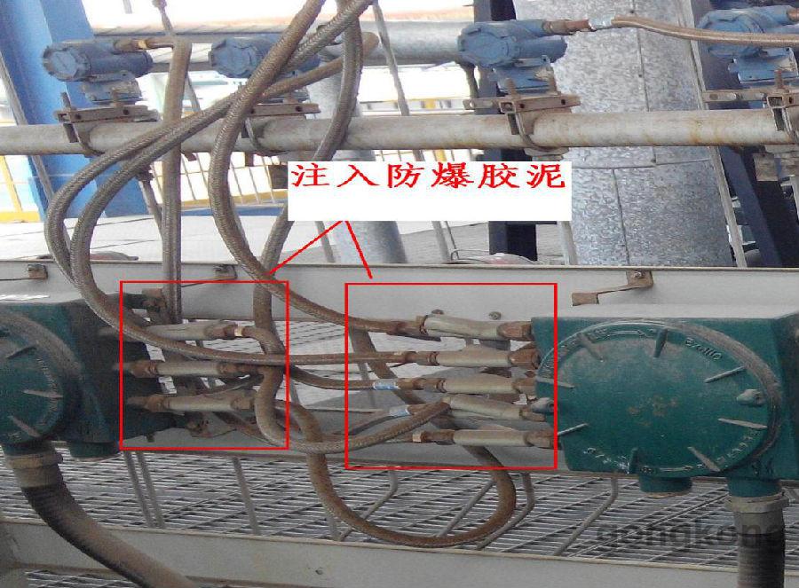 先前使用的挠性防爆软管与仪表的电缆进线口,通过金属连接件实现直接连接,金属挠性防爆软管的前方侧接有异形y型防爆接线盒。通过对防爆接线盒注入防爆胶泥的办法来实现危险气体的隔绝措施,以此来达到防爆要求。这种防爆方法无法做到防爆软管侧雨水的渗漏密封措施,导致雨水沿着挠性防爆软管内壁流入仪表内部,引发电路板进水短路而烧毁。【上海颐品自动化】