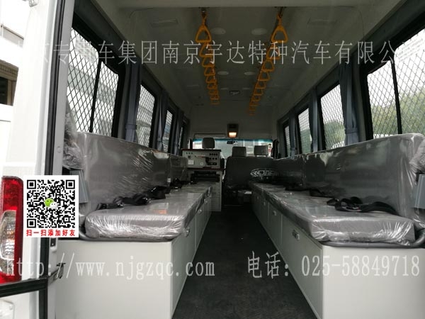 系统;100w长条灯、灯凸台、四周爆闪灯、外观、副驾驶手动门(选装电动门)、贴膜、整车;车内照明系统;长排座柜(两点式安全带);器材装备柜,(选装高音喇叭、车外照明灯、车顶车内监控、硬盘录像机等费用另计)、上车踏板、花纹铝地板、车顶扶手、拉手、中央空调、车内顶行李架、,整车载客人数大概在20人左右,另可根据用户要求加装各种设备。