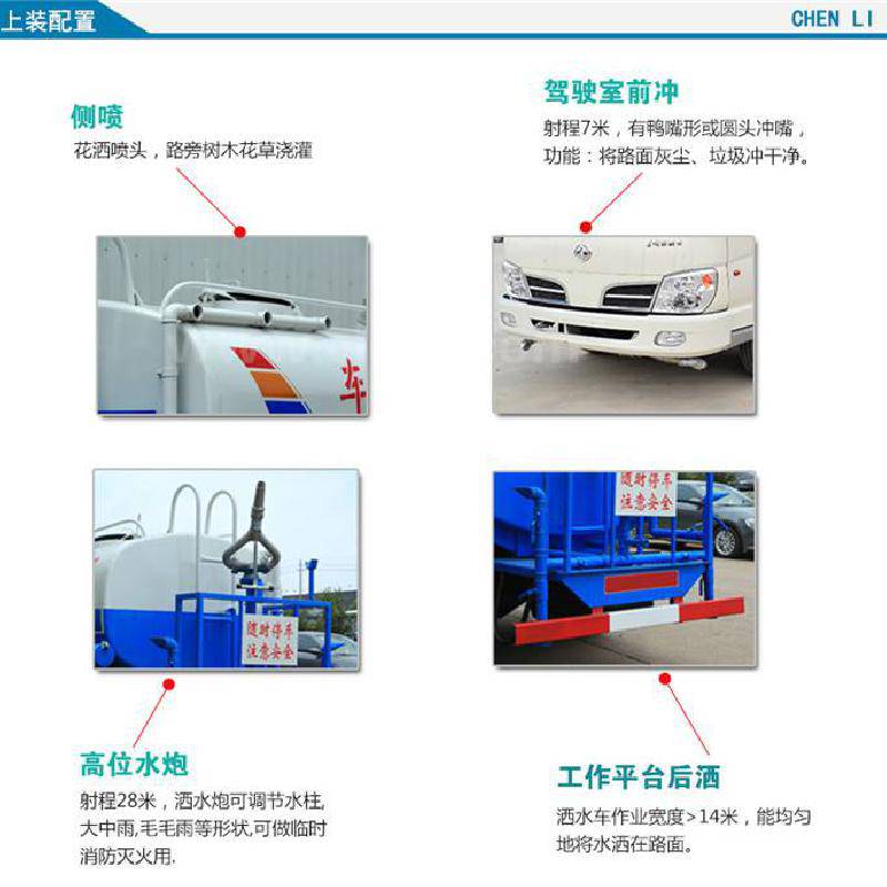 上装配置 :公告容积11.15方,实际容积:14方,严格外形尺寸:7500/2480/3200,罐体尺寸:4500/2350/1550,4mm碳钢板,60/90亿丰泵,前冲,后洒,侧喷,平台及炮(炮喷射形状可调:直冲状、大雨、中雨、毛毛雨,可连续调节),右边2个可卸式花洒,(1)全车50大通经伐,(2)泵上消防出口为球阀式,前后主管道加粗,防腐垫。(3)冲孔平台,爬梯,脚踏,(4)新式护网及支架,罐顶2个小黄色灯,52后4计6个黄铜球阀。