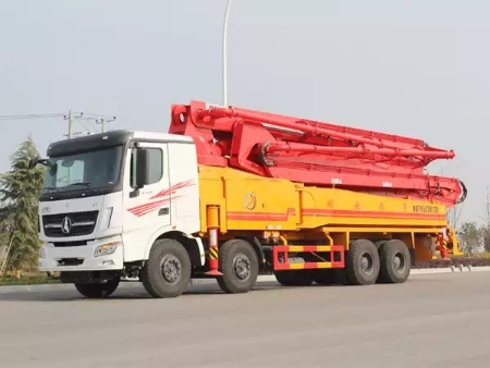 (二)配备液压卷折式臂架,在工作范围内能灵活的转动,布料方便快捷,而且泵送速度快,一般在 80m3/h -150m3/h,工作效率高。
