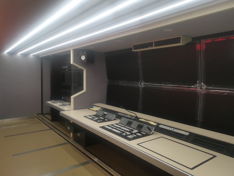 技术区5组机柜(含2组强冷机柜),导播区双层6台55监视器,导播监看一目了然,导播桌可电动平移,满足导播的随性需求,音频区独立吊机柜,