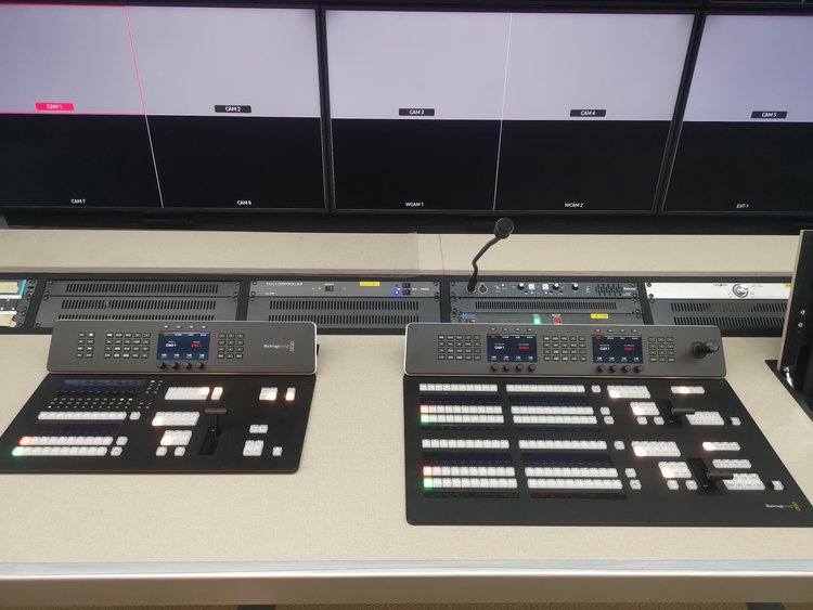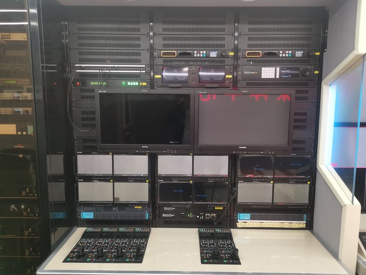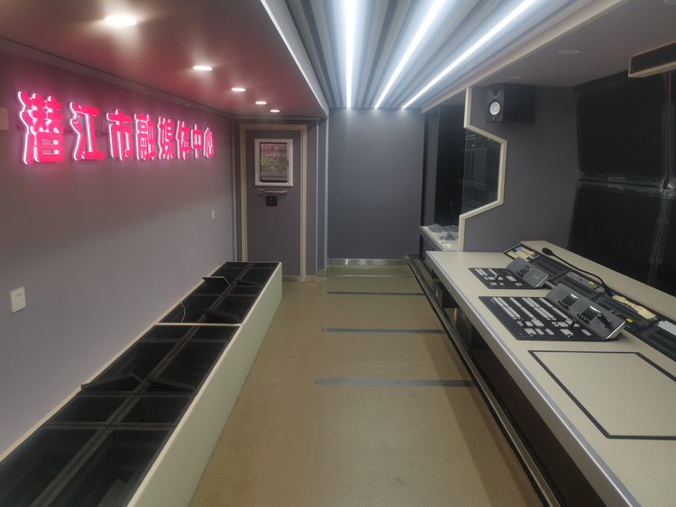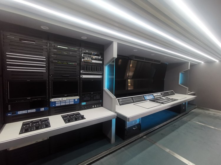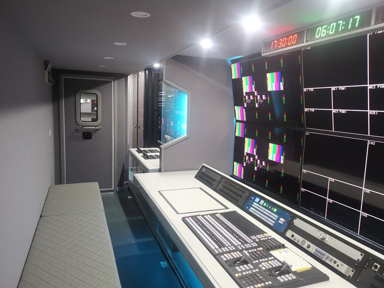 技术区5组机柜(含2组强冷机柜),导播区双层6台55监视器,导播监看一目了然,导播桌可电动平移,满足导播的随性需求,音频区独立吊机柜,