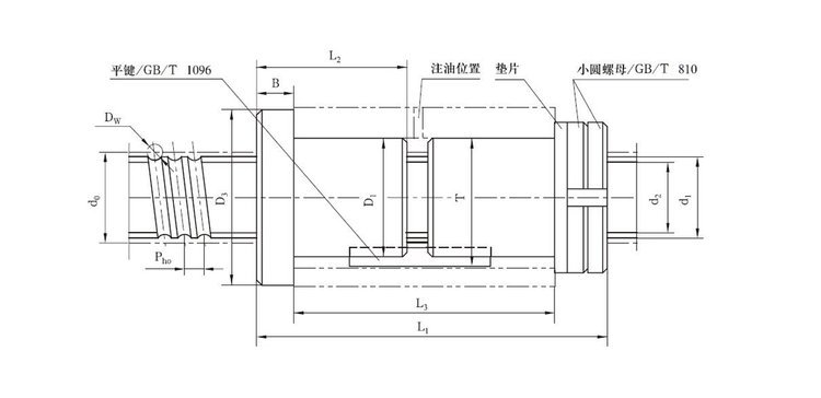 | 规格代号 | 公称 | 公称 | 丝杠 | 钢球 | 丝杠 | 循环 | 动载荷 | 静载荷 | 刚度 | 螺母尺寸 | 圆螺母 | 平键 | ||||||