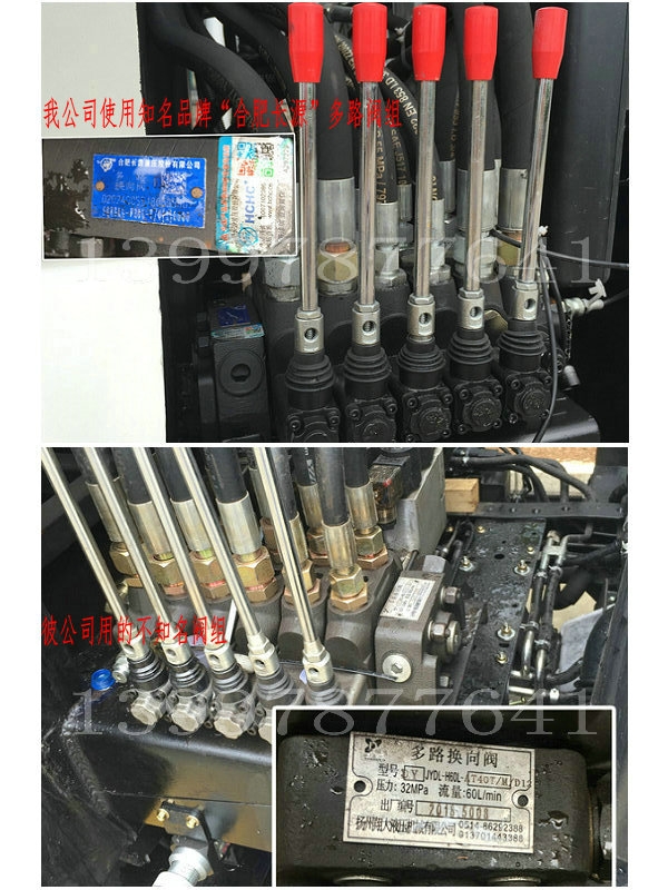 2、关键部件:我公司采用知名品牌“合肥长源”多路控制阀组,经过多种设备检测试验,无砂眼,无气泡轻松承受液压泵提供的压力,达到控制油路的顺畅操作;而不知名的小厂的部件因受技术力量和检测设备等高昂费用的局限而出现砂眼漏油、开裂、运行不舒畅等故障导致整个液压系统的瘫痪!如图对比: