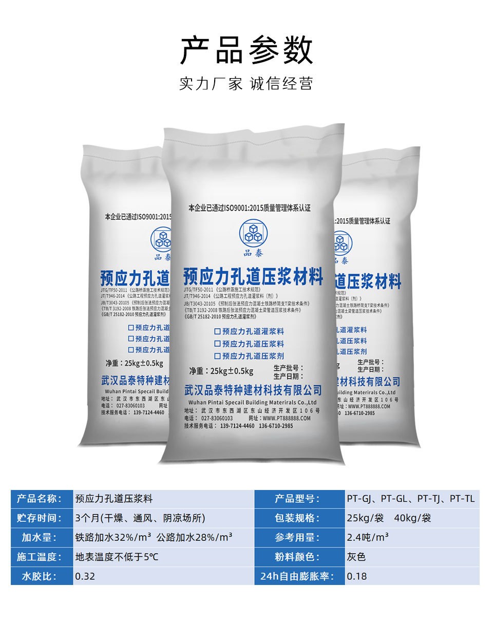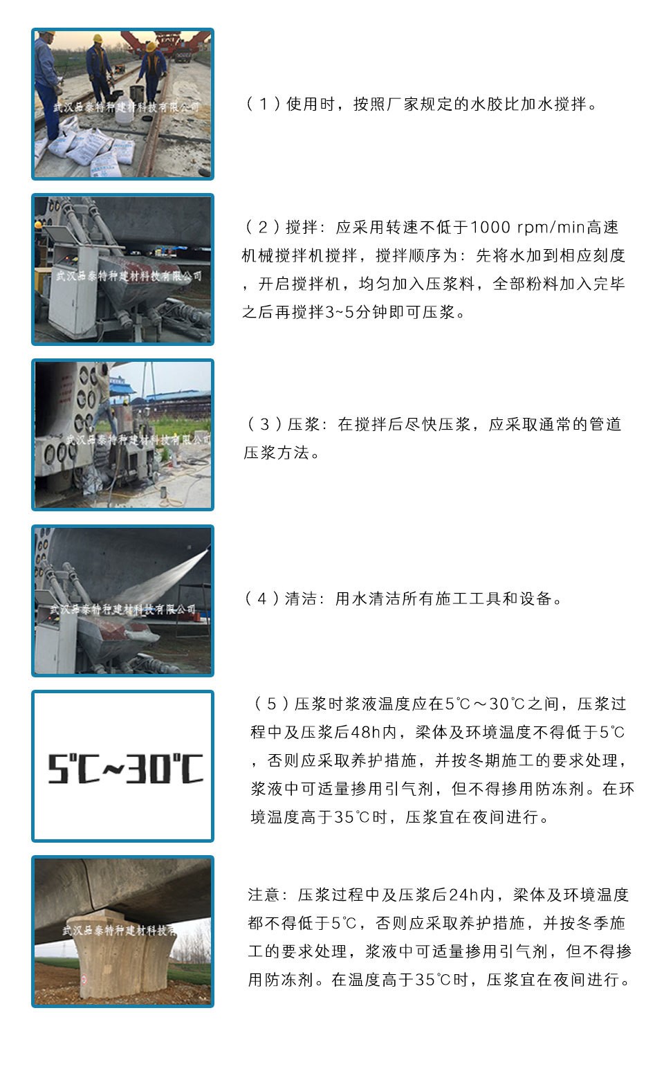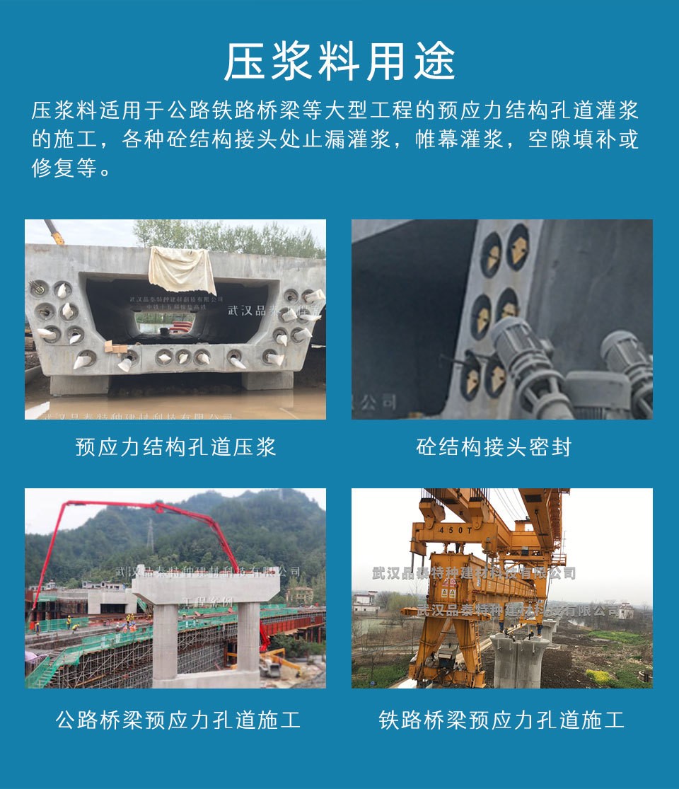 压浆料适用于公路铁路桥梁等大型工程的预应力结构孔道灌浆的施工,各种砼结构接头处止漏灌浆,帷幕灌浆,空隙填补或修复等。