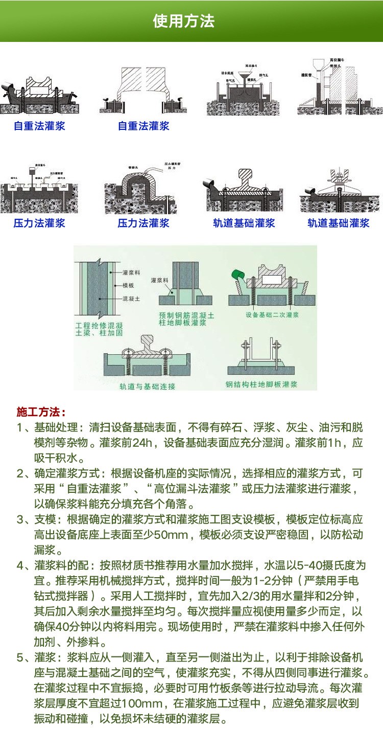 该产品适用于铁路桥梁、公路桥梁、核电站等大型工程的预应力结构孔道灌浆的施工,各种砼结构接头处止漏灌浆,帷幕灌浆,锚固灌浆,空隙填补或修复等。
