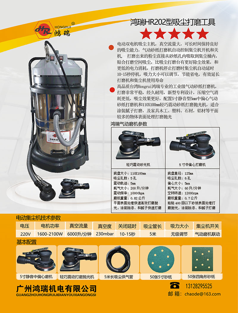 3、中国台湾鸿瑞高品质工业级气动磨机,可在工厂打磨线长时间打磨,内螺纹吸尘口结构,吸尘管直接旋进磨机吸尘口不会松脱了。5寸低耗气中偏心磨机,打磨时低耗气少、排气噪音低,符合国内和欧盟打磨噪音要求,粘贴400目以下砂纸玻璃钢、环氧树脂、碳纤维等复合材料、铝材、大理石、木制品、橡塑制品、金属氧化层等表面处理快速打磨抛光,涂装除漆、和腻子快速打磨;110x100mm轻巧四方型磨机震动式打磨,大平面玻璃钢、环氧树脂、碳纤维等复合材料、铝材、大理石、木制品、橡塑制品、金属氧化层等表面处理快速打磨抛光,涂装除漆、和腻子快速打磨